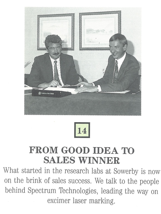 5月,美国McDonnell Douglas飞机公司向OLT提交了准分子激光打标系统的报价请求。作为研究中心的一部分,OLT无法对这样的商业要求作出回应,总部设在加利福尼亚州的美国Vektronics公司中标。然而,行业兴趣和需求的增加促进了形势的发展,8月,英国航空航天董事会批准成立光谱科技公司,作为向BAE企业报告的全资子公司。10月,光谱科技公司成立。Peter Dickinson在其索尔比研究中心发起并领导了BAE的工业激光研究项目,他被任命为Spectrum的董事兼总经理,而企业的新项目总监理查德·胡克(Richard Hooke)则成为董事长。